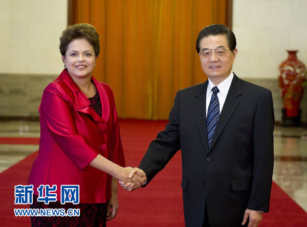 On the afternoon of April 12, 2011, President Hu Jintao held wide-ranging and fruitful talks in an in-depth, friendly manner with Brazilian President Dilma Rousseff at the Great Hall of the People. Both sides reached broad consensus on a series of major issues including furthering bilateral ties.